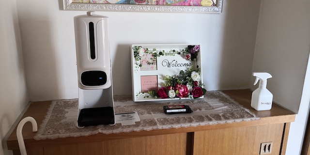 玄関にある自動検温器&自動アルコール消毒装置で検温と手指の消毒が出来ます